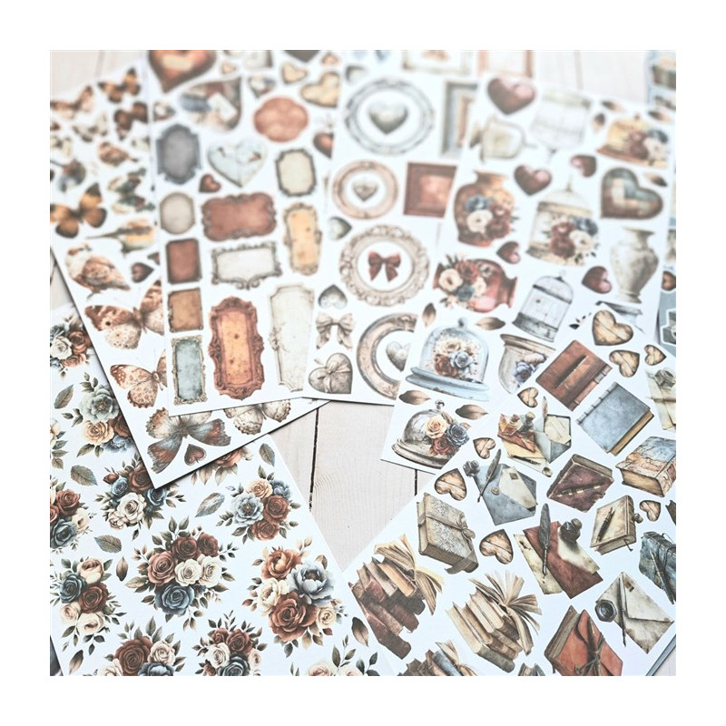 Set di 18 fogli di cartoncino per scrapbooking, 18 design diversi, + extra dietro la copertina, con elementi da ritagliare.