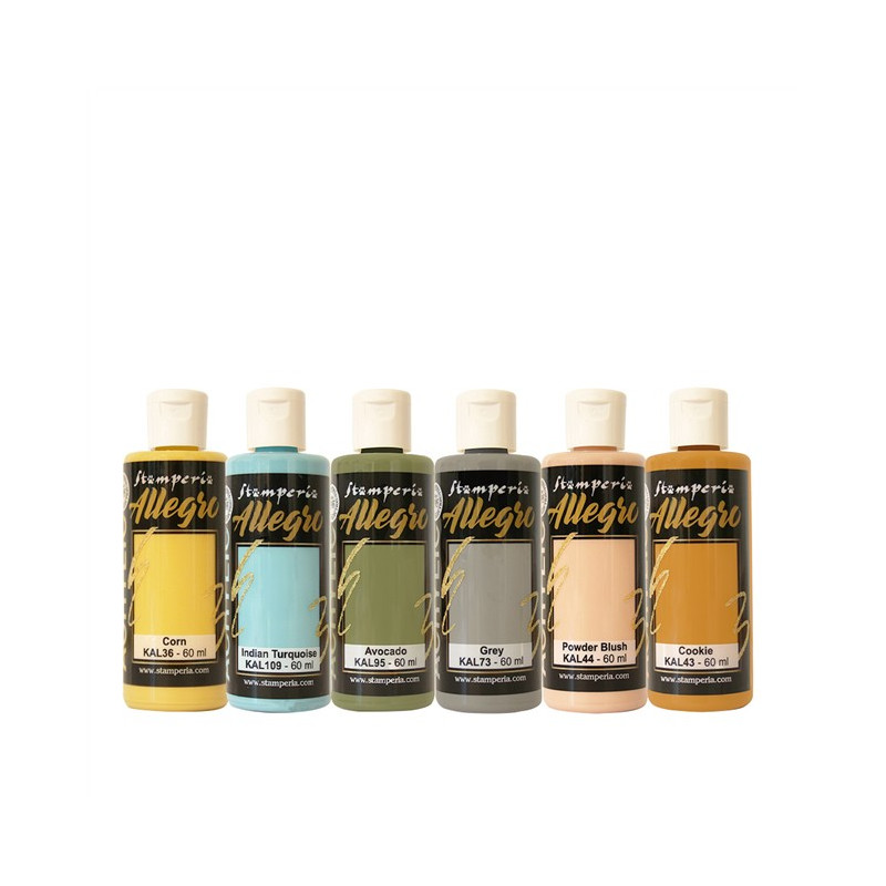Kit di colori acrilici composto da 6 flaconi nei colori: Corn, Indian Turquois, Avocado, Grey, Powder Blush, Cookie.