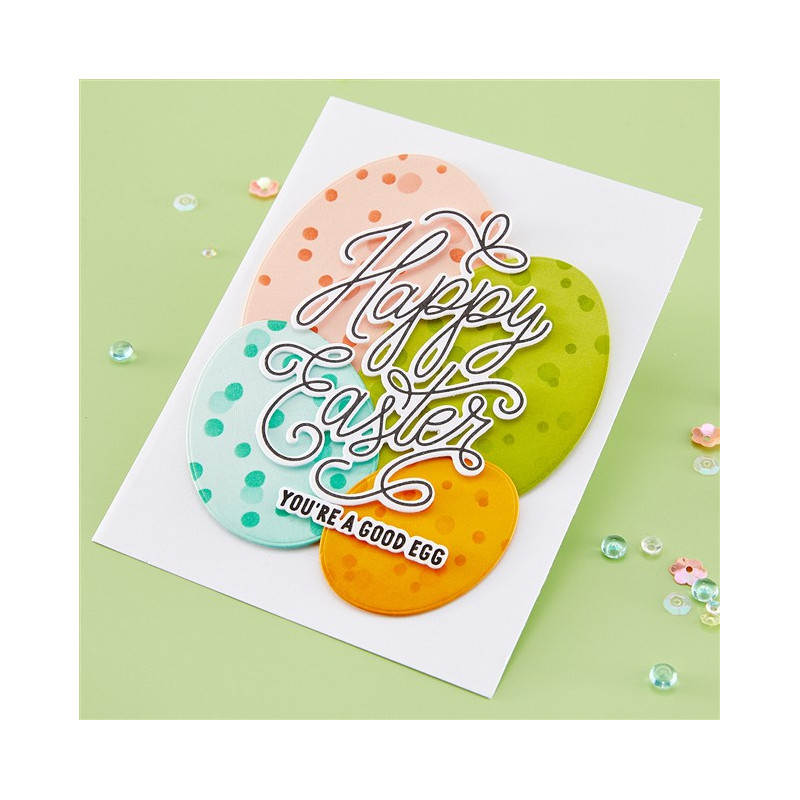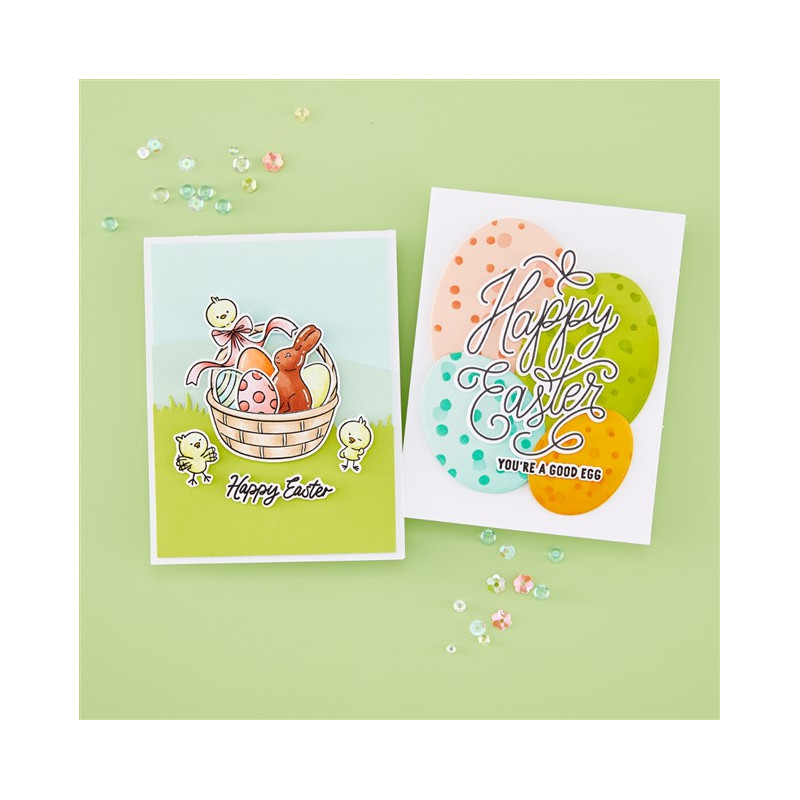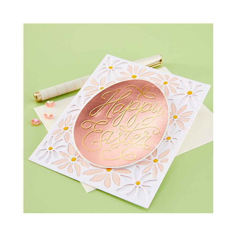 Perfetto da utilizzare con i sistemi di stampa a caldo BetterPress e Glimmer, questo set include due piastre di stampa e due fustelle coordinate che creano un saluto a forma di uovo splendidamente dettagliato con un grazioso lettering. Utilizzatelo per stampe tipografiche classiche, per splendidi dettagli in lamina o per entrambi, per un look elegante e raffinato. Abbinatelo a uno sfondo delicatamente stencilato o a un motivo audace per creare biglietti di Pasqua raffinati e di facile realizzazione.