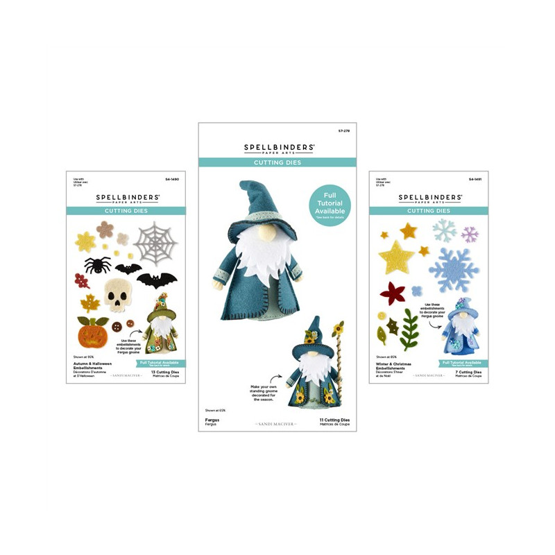 Il set di fustelle Fergus 3D Felt Décor Collection include tutte le fustelle di questa collezione di Sandi MacIver: S7-278 Fergus, S4-1490 Decorazioni Autunnali e di Halloween e S4-1491 Decorazioni Invernali e Natalizie. Insieme, questo set permette di creare Fergus, lo gnomo, pronto per le stagioni autunnali e invernali... e per tutto il resto!