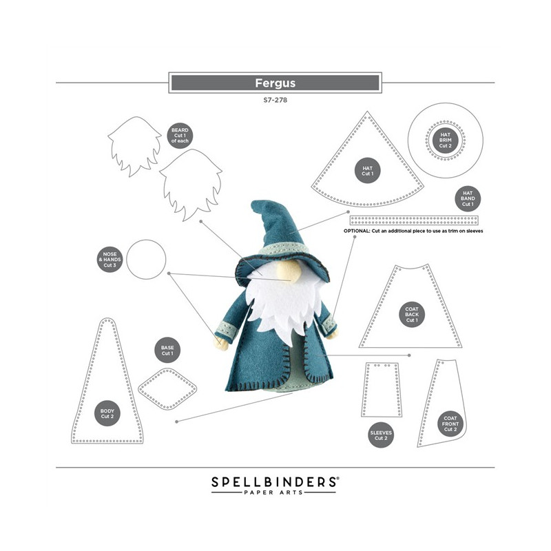 Le fustelle Fergus fanno parte della collezione 3D Felt Décor di Sandi MacIver. Una volta assemblate, queste 11 fustelle in metallo sottile creano uno splendido gnomo tridimensionale! Le cuciture dettagliate sui bordi conferiscono un aspetto meraviglioso e rifinito e creano una guida per cucire lo gnomo.