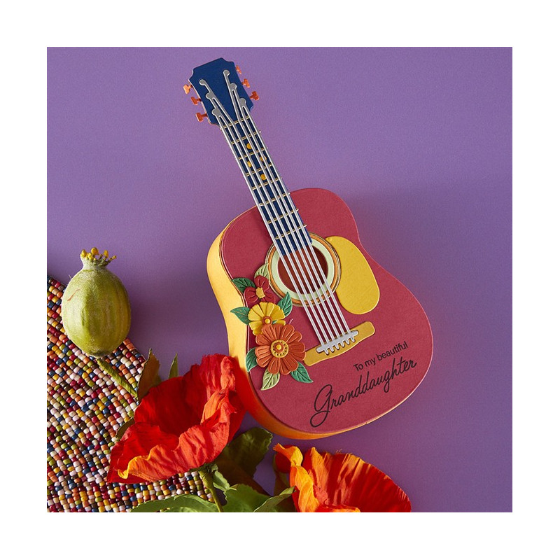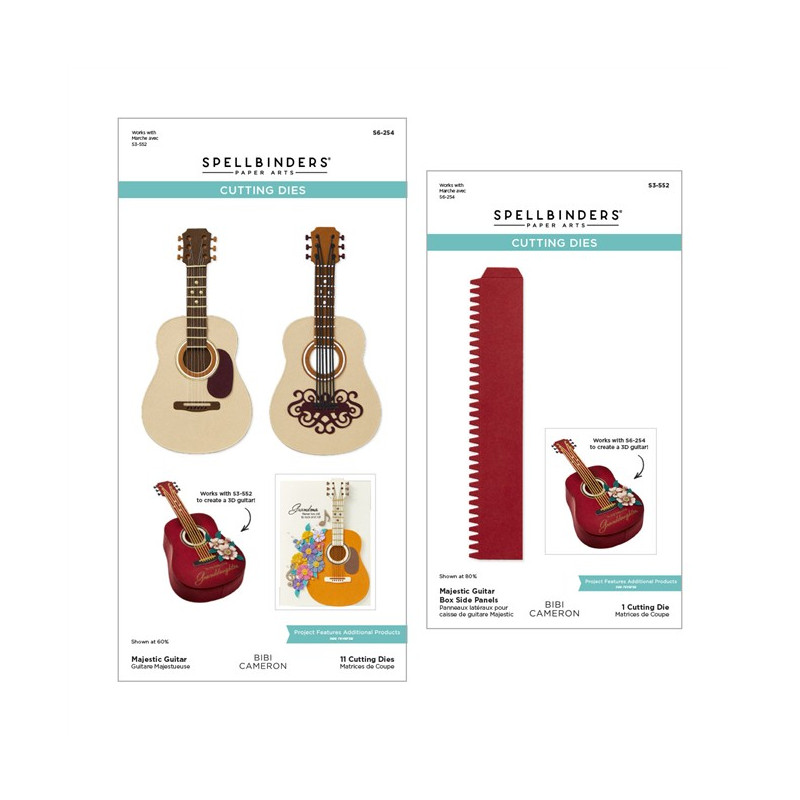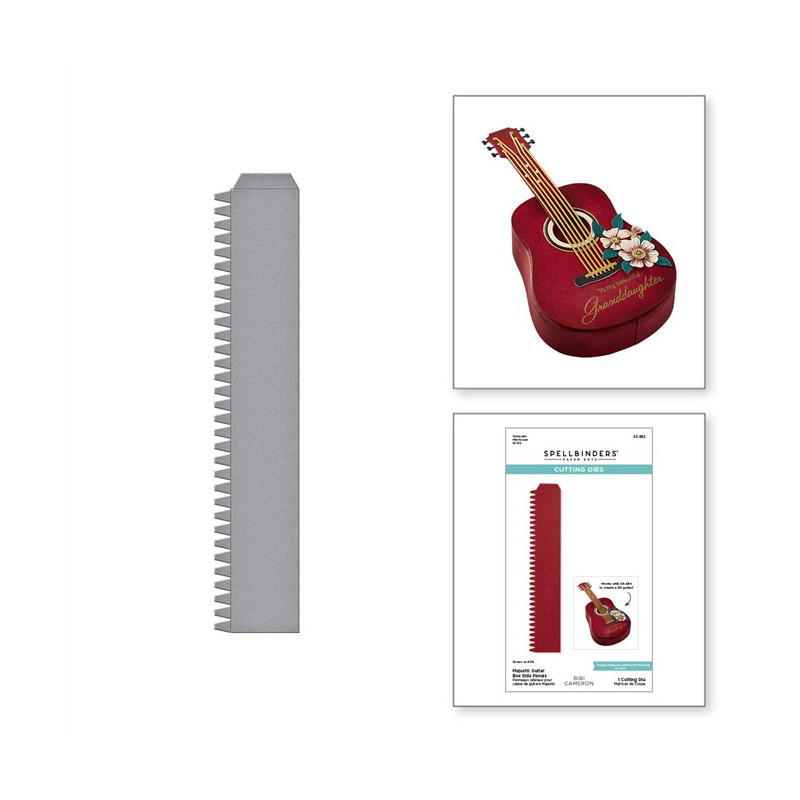 Il Majestic Guitar Box Creator Bundle fa parte della collezione Bibi's Musical Notes di Bibi Cameron. Questo bundle include i pannelli laterali S3-552 per Majestic Guitar Box e la chitarra S6-254 per Majestic Guitar. Il set Majestic Guitar crea una magnifica chitarra che misura circa 8,70 x 17,80 cm. Abbastanza grande da contenere il fronte di un biglietto di formato A7 o più grande! Trasformala in una scatola a forma di chitarra unica utilizzando il pannello laterale Majestic Guitar Box per ritagliare le pareti. Espandi le pareti fustellando e incollando le linguette terminali di alcuni pannelli. Fissa la parete alla forma incollando le linguette inferiori ai bordi inferiori della forma. Questa fustella per pannelli trasforma le forme base in opere d'arte tridimensionali! Un set ingegnoso e unico: acquistalo subito!