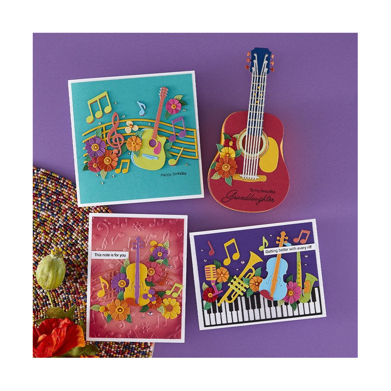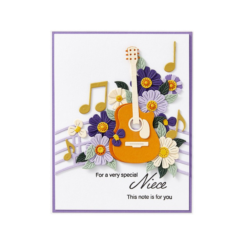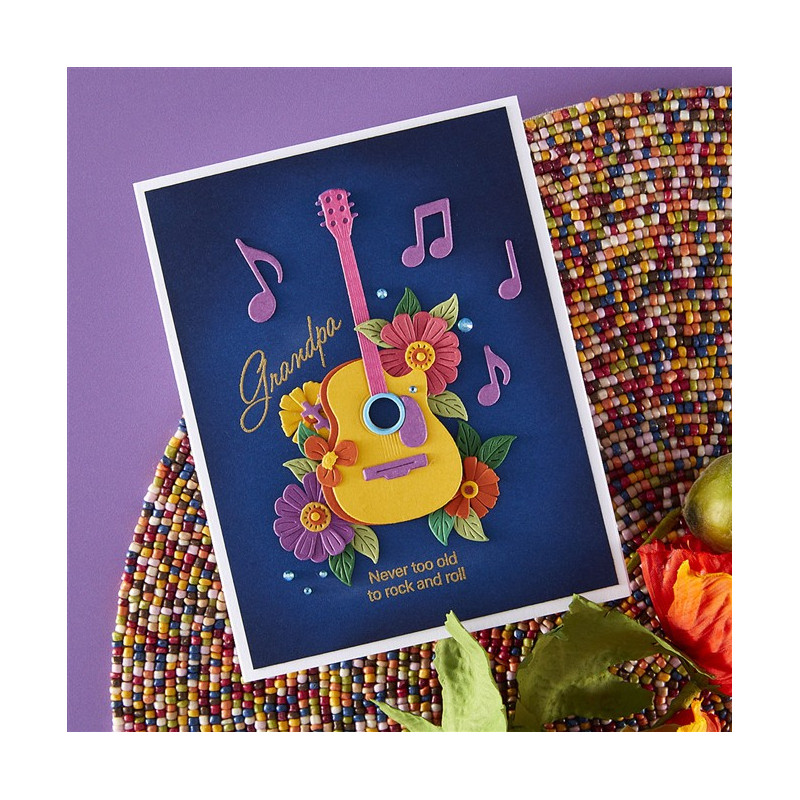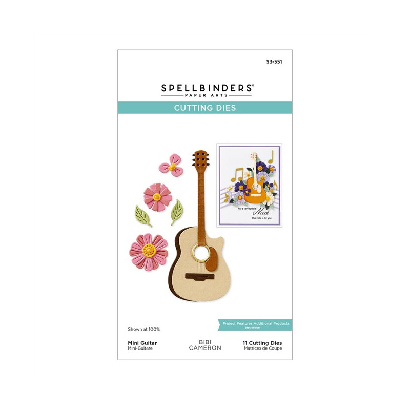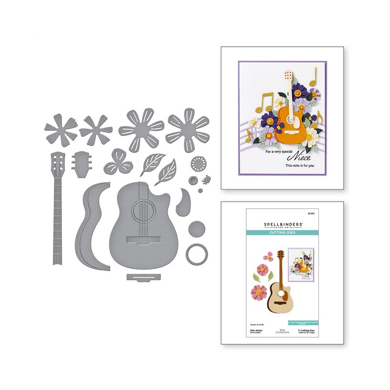 Le fustelle Mini Guitar fanno parte della collezione Bibi's Musical Notes di Bibi Cameron. Una volta assemblate, queste 11 sottili fustelle in metallo creano una chitarra meravigliosa, con dettagli floreali che la rendono ancora più bella!