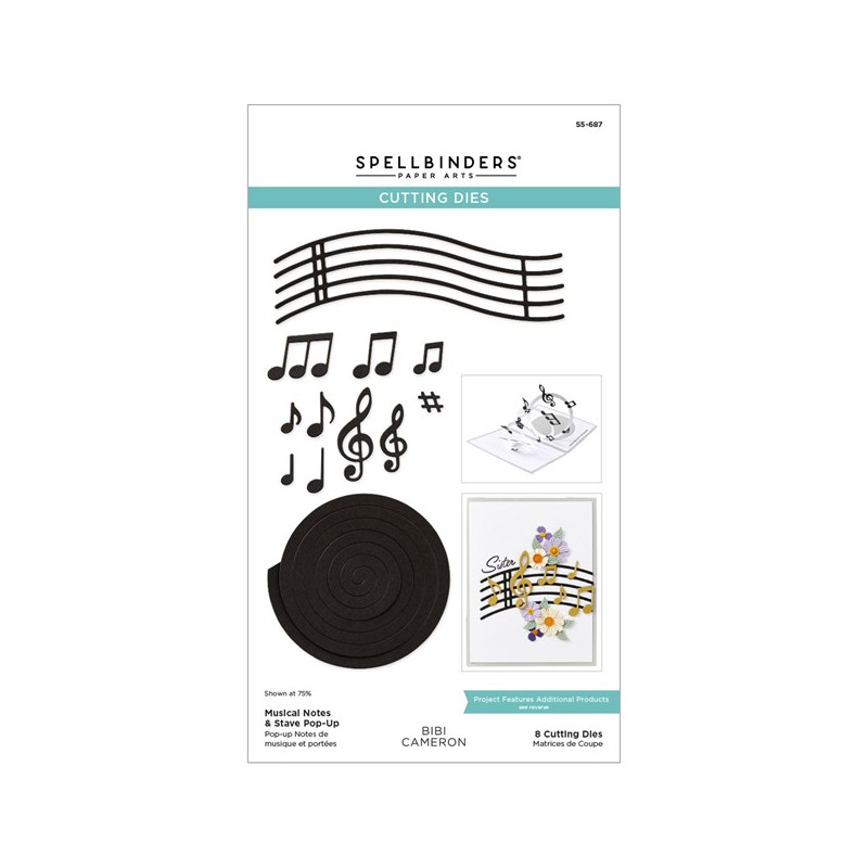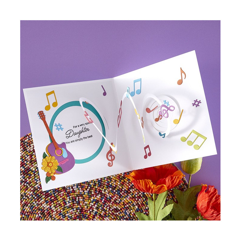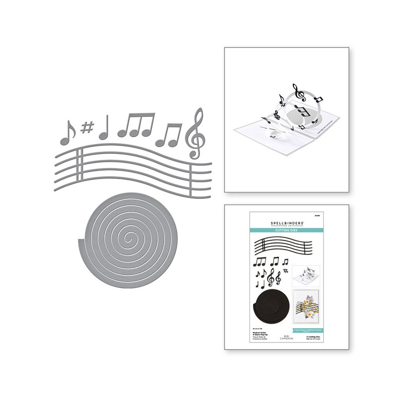 Le fustelle "Note Musicali e Pentagramma Pop-Up" appartengono alla collezione "Bibi's Musical Notes" di Bibi Cameron. Questo versatile set di 8 sottili fustelle in metallo crea pentagrammi pieni di notazione musicale e un effetto pop-up a spirale. Queste fustelle danno davvero vita alla musica!