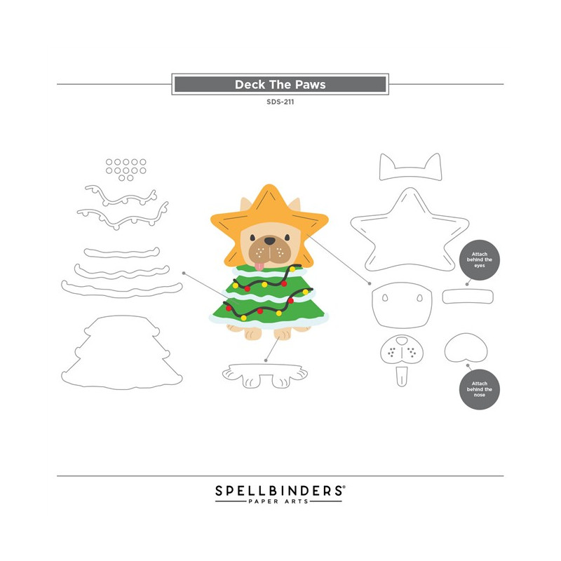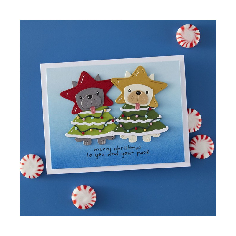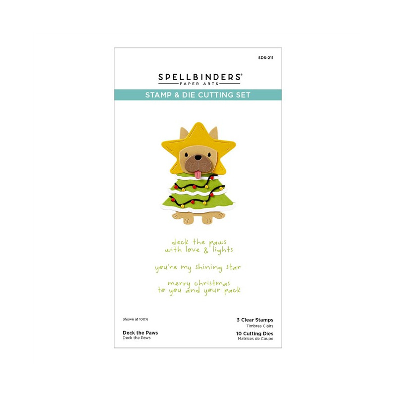Il set di timbri e fustelle "Deck the Paws" fa parte della collezione "Merry Mischief". Chi può resistere a un tenero cucciolo vestito da albero di Natale? Le 10 sottili fustelle in metallo hanno tutto il necessario per realizzarlo... persino le luci natalizie! Sono inclusi 3 timbri con frasi d'amore perfetti da usare con il cucciolo decorato: "Buon Natale a te e al tuo branco", "Decora le zampe con amore e luci" e "Sei la mia stella splendente". Il cucciolo decorato misura circa 5,60 x 7,30 cm.