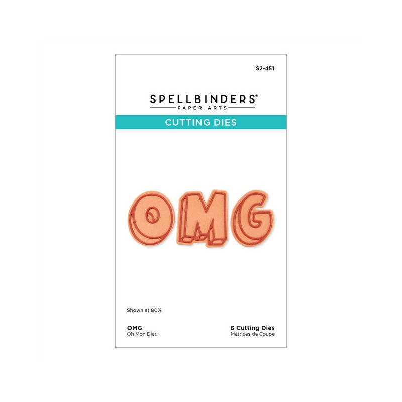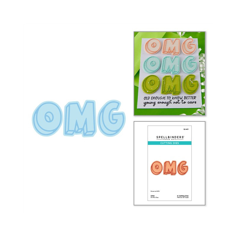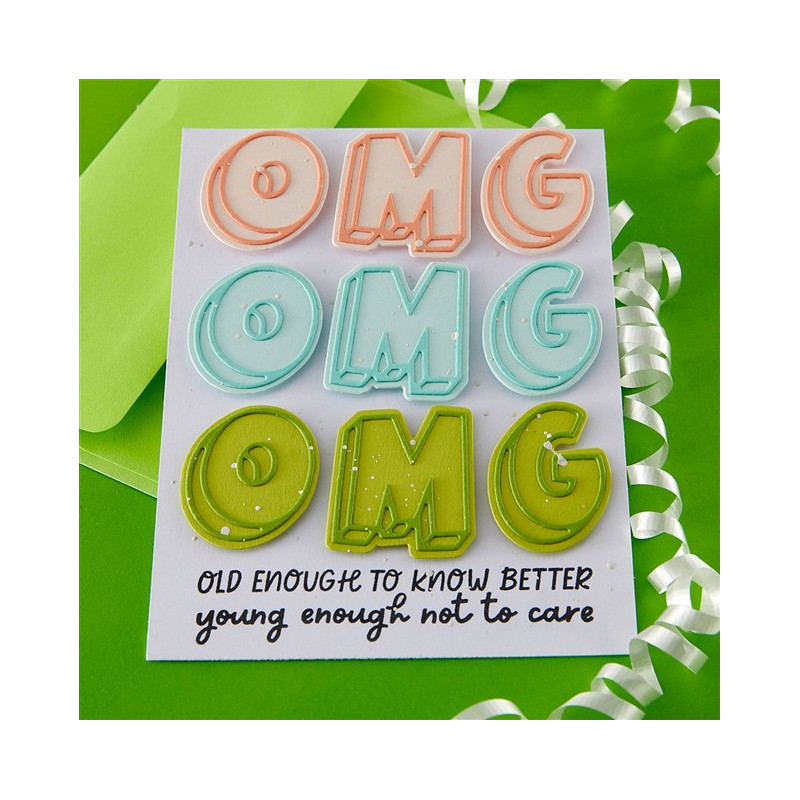 Le fustelle incise "OMG" fanno parte della collezione "Aged to Perfection". Una volta assemblate, queste 6 sottili fustelle in metallo creano una scritta "OMG" ombreggiata, perfetta per esprimere un sentimento audace sul fronte di un biglietto o per un sottotitolo su una pagina di album.