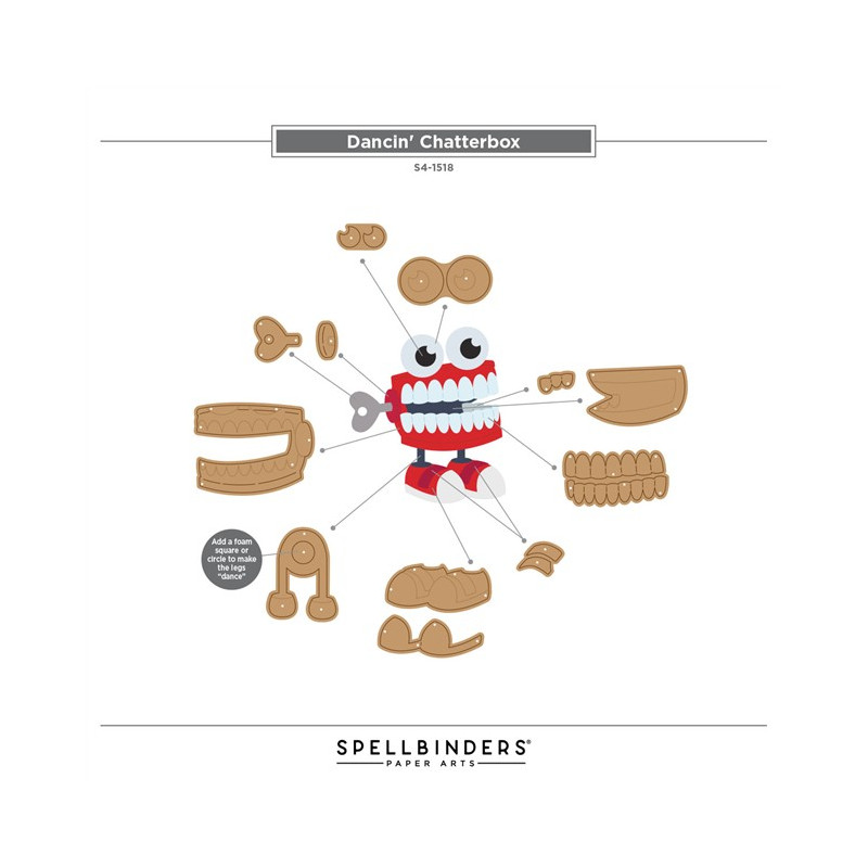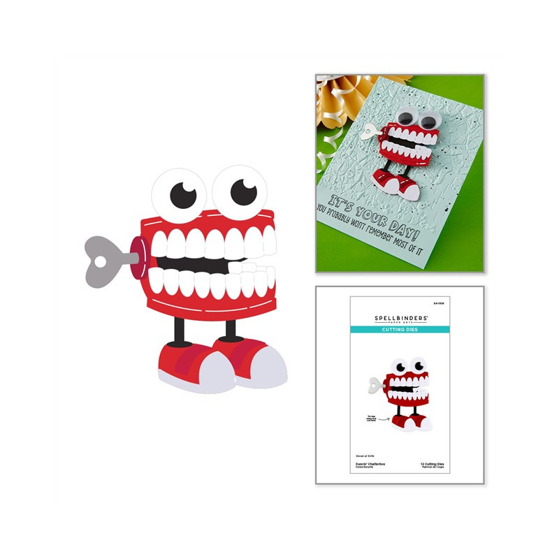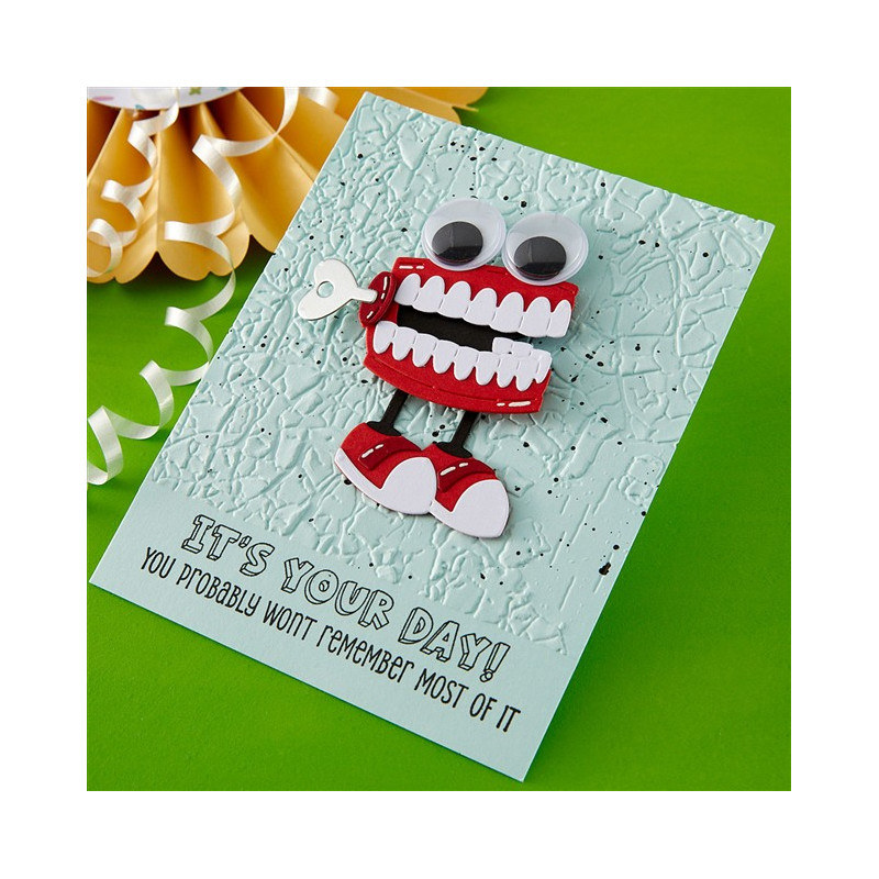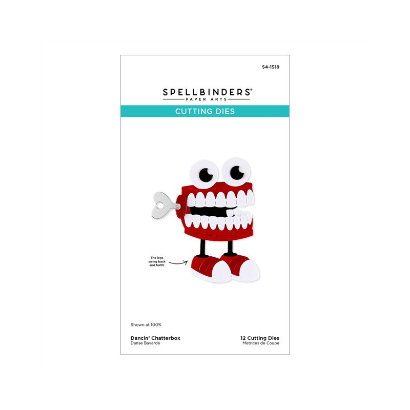 Le fustelle incise "Dancin' Chatterbox" fanno parte della collezione "Aged to Perfection". Questo set di 12 sottili fustelle in metallo crea una dentatura a carica con una chiave e un paio di gambe! La parte migliore? Le gambe oscillano avanti e indietro!