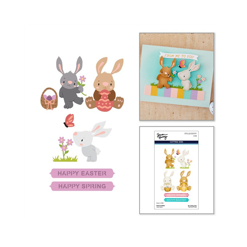 Le fustelle incise "Bunny Buddies" fanno parte della collezione "Happy Spring". Questo set di 28 fustelle sottili in metallo vi riempirà di gioia! Ci sono diversi modi per posizionare i coniglietti: seduti, sollevati e persino di profilo. Sono inclusi anche motivi a tema primaverile come uova decorate, cestini, fiocchi, fiori, erba e altro ancora. Aggiungete al vostro progetto uno dei due messaggi: Buona Pasqua e Buona Primavera. Questo set ne racchiude tantissimi!