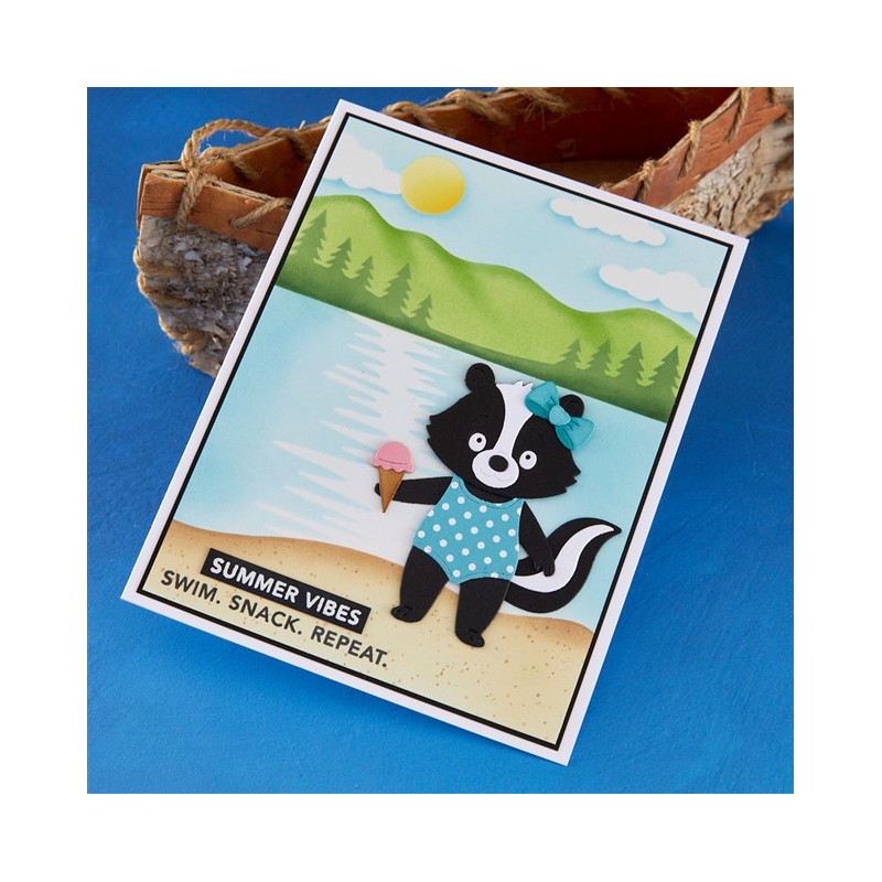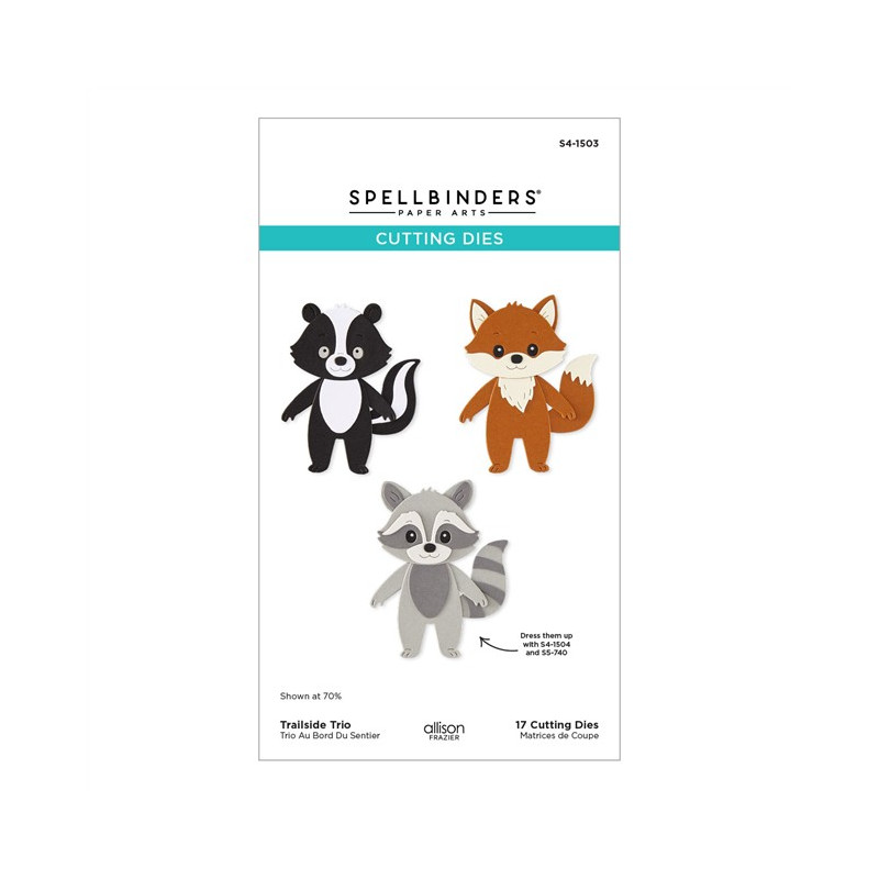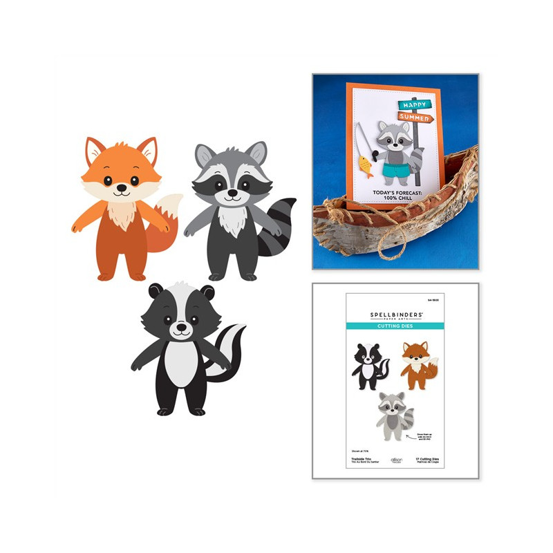 Le fustelle Trailside Trio fanno parte della collezione Summer Camp di Allison Frazier. Questo set di 17 fustelle in metallo sottile permette di creare tre simpatici amici del bosco: una volpe, un procione e una puzzola.
