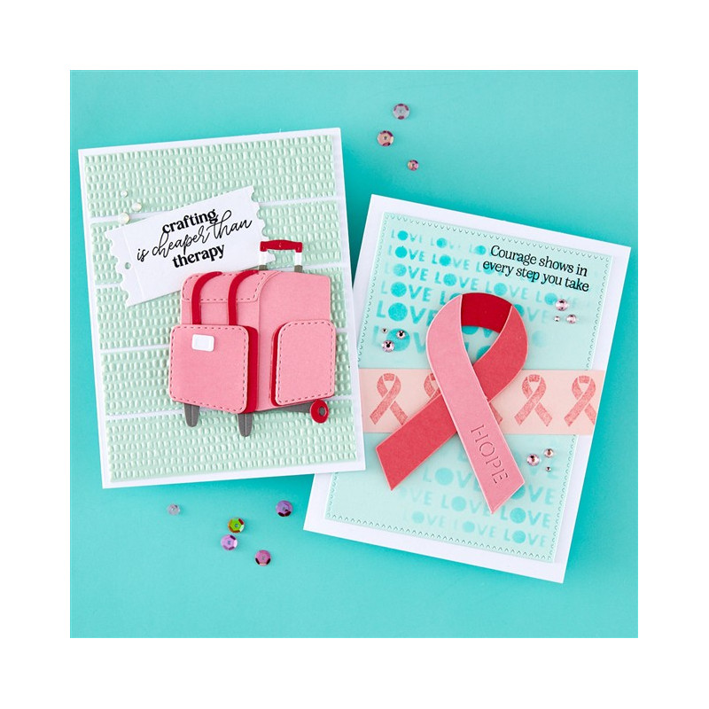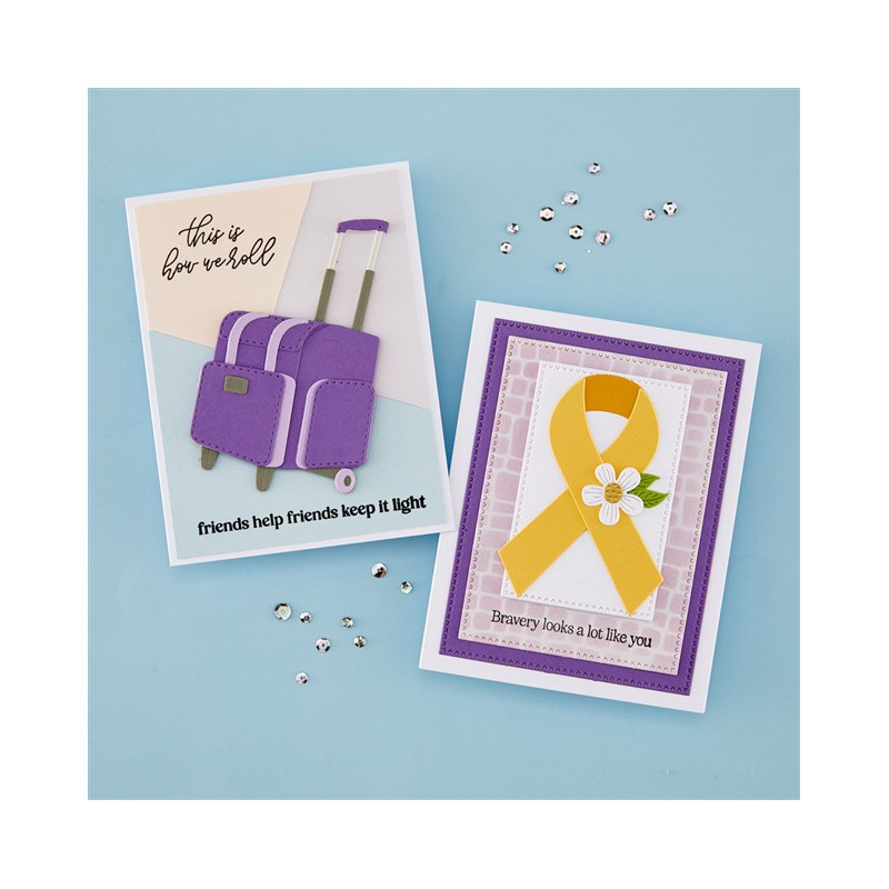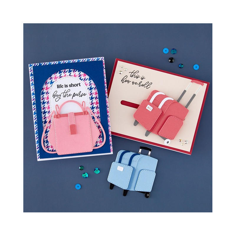 Le fustelle incise Rolling Craft Tote fanno parte della collezione We All Have Baggage di Sheri Ballantyne. Se ti dedichi al fai da te, conoscerai sicuramente questa borsa con le ruote o magari ne possiedi già una! Una volta assemblate, queste 12 fustelle in metallo sottile permettono di creare una borsa con il manico