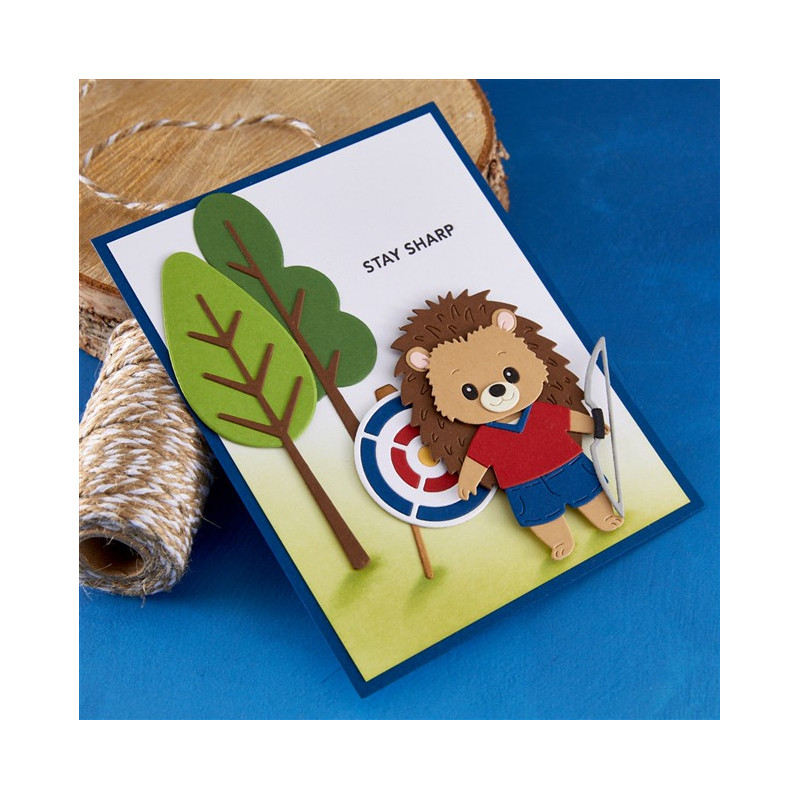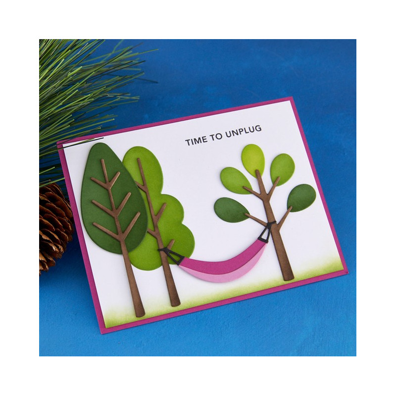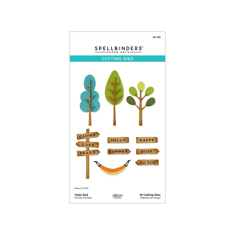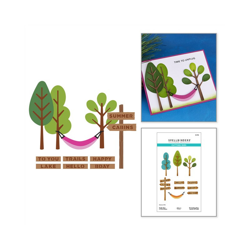Le fustelle Trails End Etched Dies fanno parte della collezione Summer Camp di Allison Frazier. Questo set di 19 fustelle in metallo sottile permette di creare uno splendido sfondo boschivo! Oltre ai tre tipi di alberi e a un cartello, che ne dite di un'amaca?