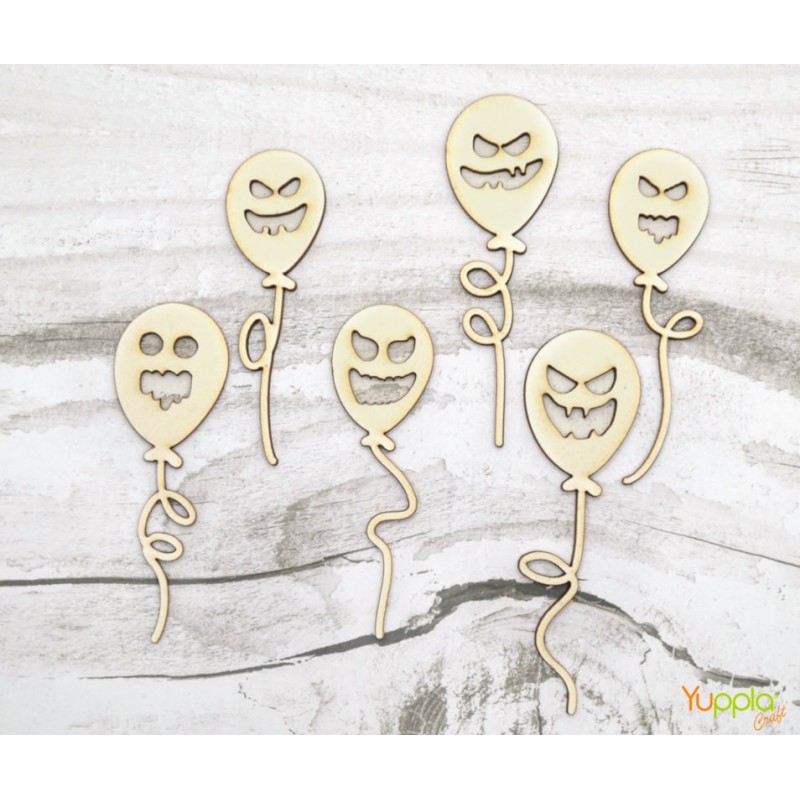Set di n. 6 palloncini in cartonlegno a tema Halloween di diverse forme e dimensioni.