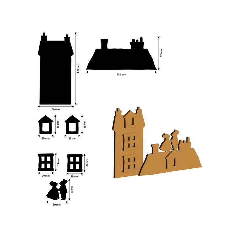 Dimensioni: casa 6,5 x 13 cm; tetto 13 x 6 cm; topini 4 x 3.5 cm