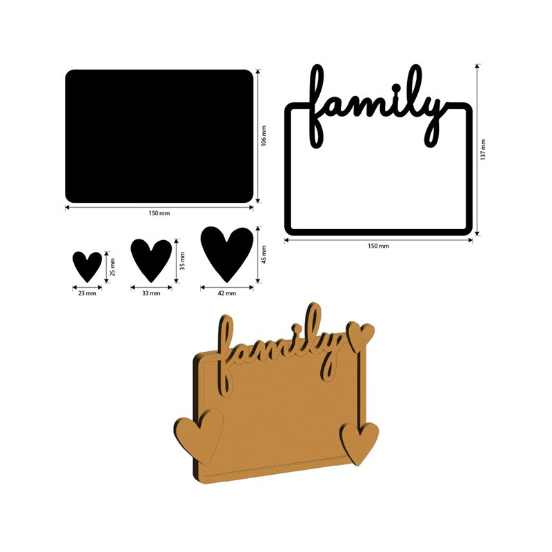 Dimensioni: sagoma con scritta 15 x 13,5 cm; plate 15 x 11 cm; cuori 2,3 x 2,5 cm - 3,3 x 3,5 cm - 4,2 x 4,5 cm