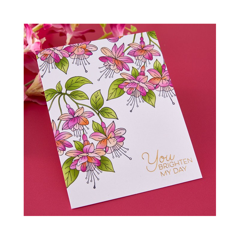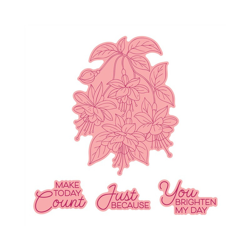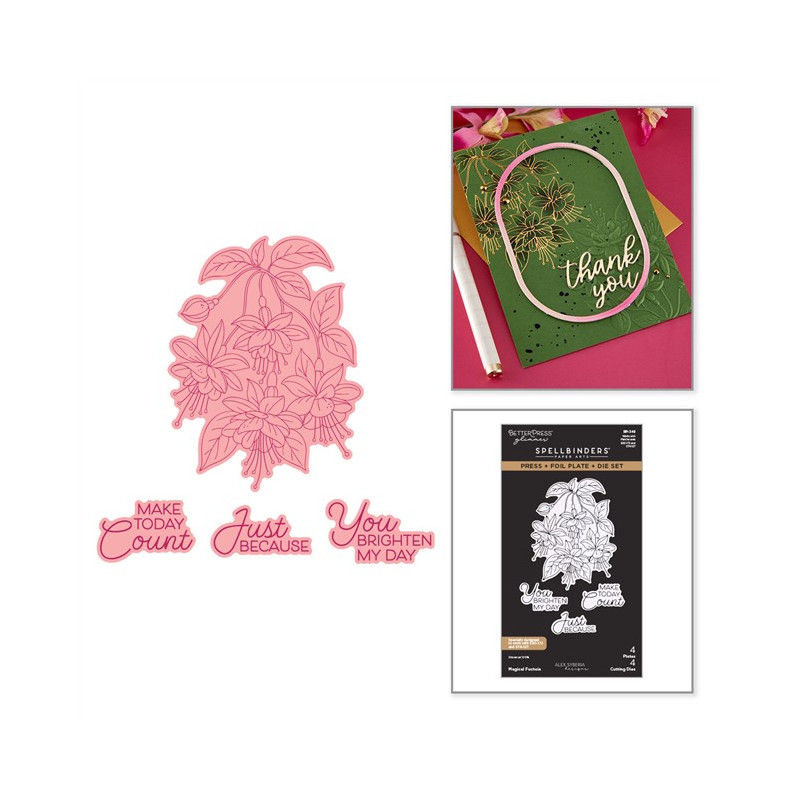 Il set di piastre e fustelle Magical Fuchsia Press + Foil Plate & Die Set fa parte della collezione Magical Fuchsia di Alex Syberia Designs. Il set, composto da quattro piastre e quattro fustelle sottili in metallo, permette di imprimere e tagliare un grande rametto fucsia e tre frasi: Just Because, Make Today Count e You Brighten My Day.
