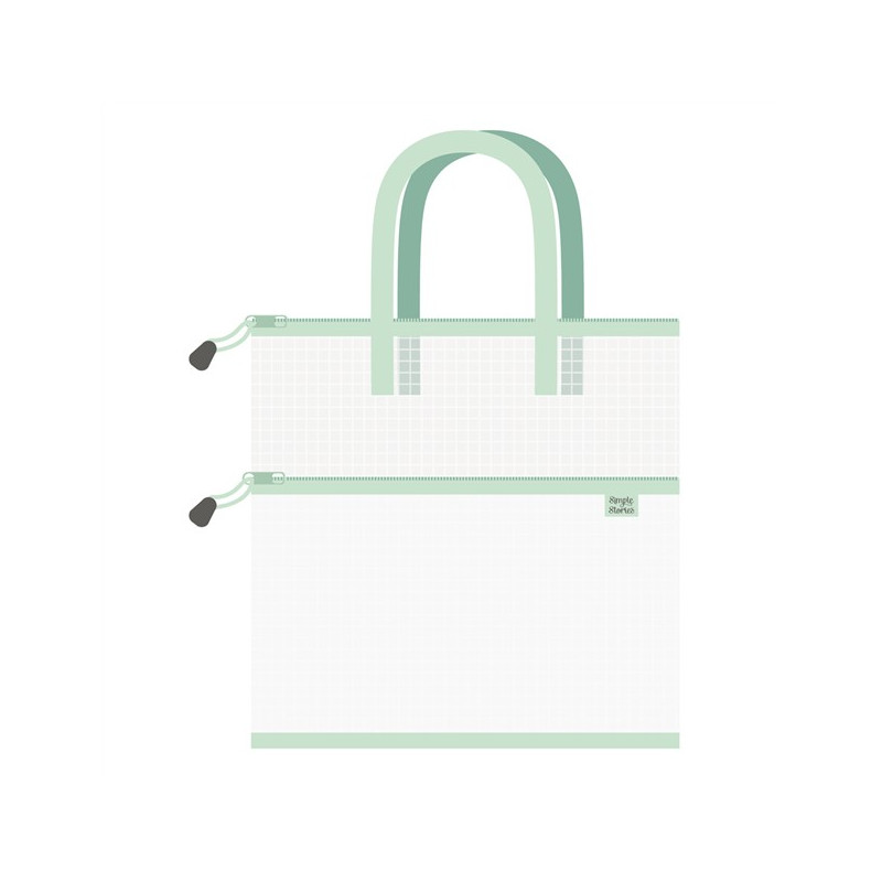La borsa portaoggetti in rete rinforzata in vinile trasparente include una tasca esterna, entrambe con chiusura a cerniera e manici facili da impugnare.
